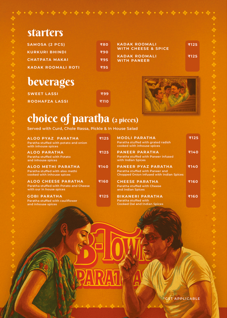At B’Town Paratha, every dish is crafted to make your taste buds dance! From the first bite to the last crumb, it’s all about big flavours, fresh ingredients, and that unforgettable ghar ka touch.