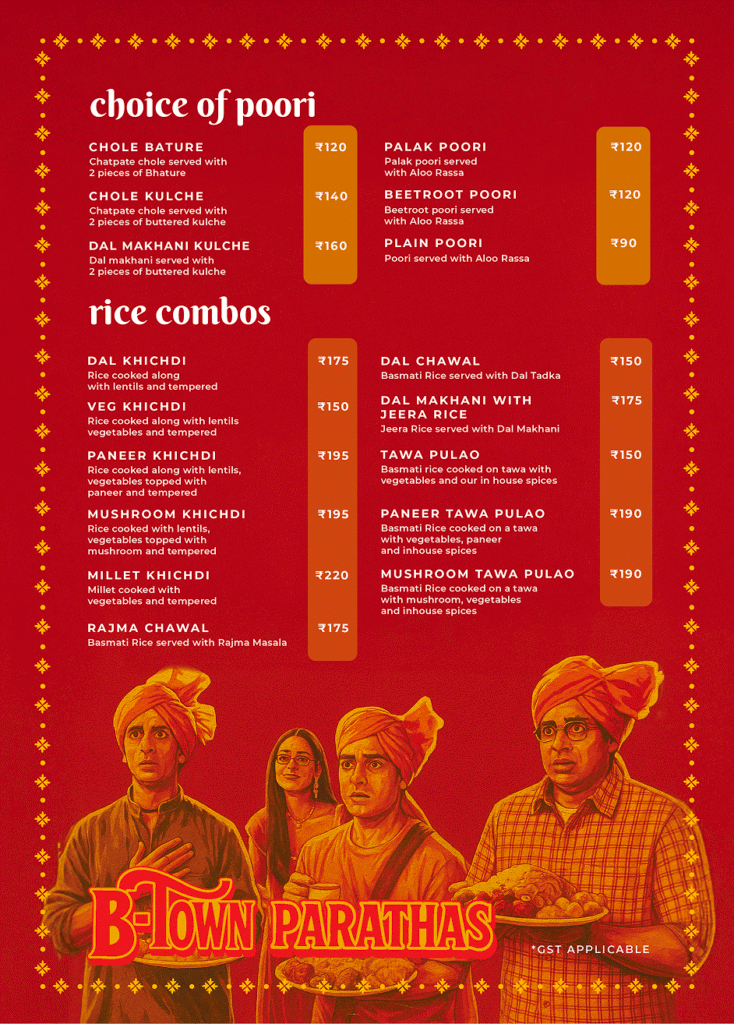We bring you parathas slathered in butter to spicy and aromatic tawa pulao. Every dish is a celebration of ghar ka swaad served with B’Town vibes.